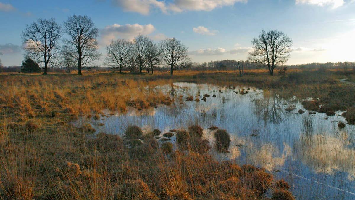 Uitgestrekt heidegebied met wandelroutes en vergezichten.